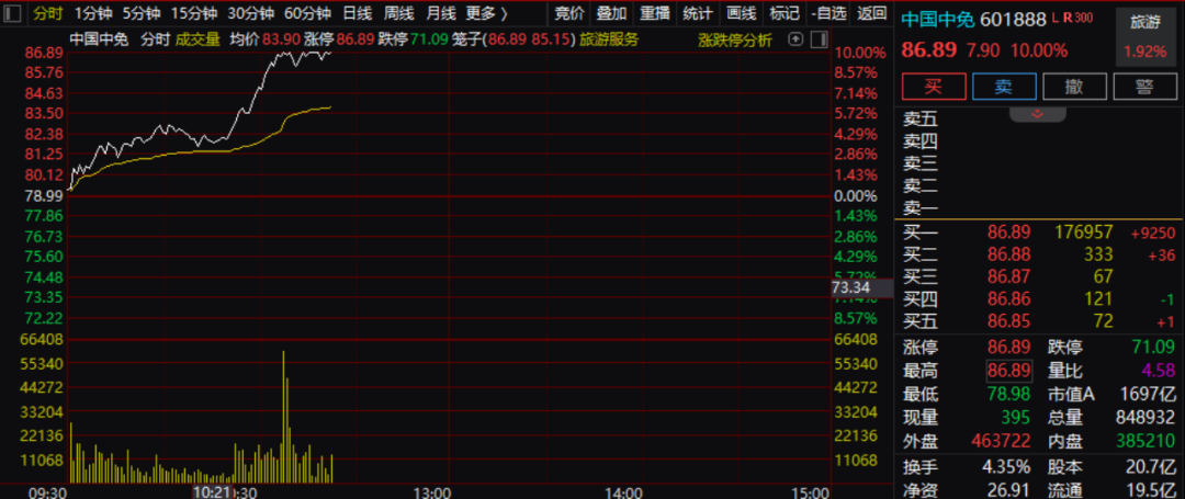 曾经的大牛股——中国中免盘中直线拉升,并一度涨停。在炒消费的时段,这只股票往往能够对整个板块起到较强的带动作用。因此,它的涨停亦有标志性意义。