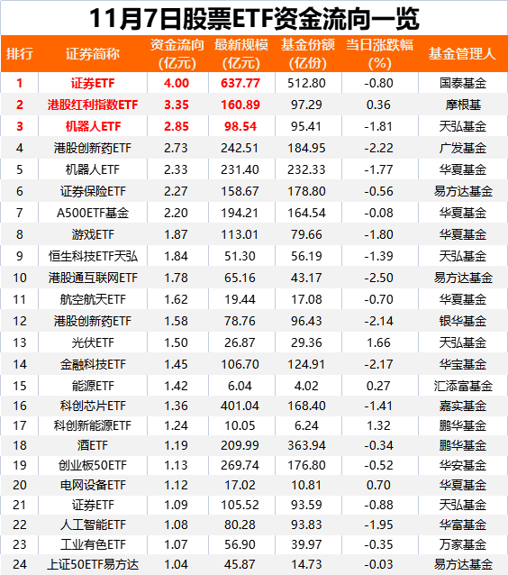 11月7日,证券保险ETF净流入2.3亿元,港股通互联网ETF净流入1.8亿元,上证50ETF易方达净流入1.0亿元,人工智能ETF净流入0.5亿元,储能电池ETF净流入0.4亿元。