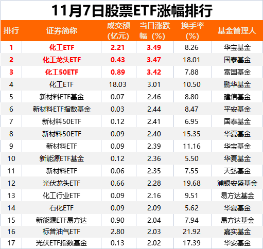 从股票ETF二级市场表现看,化工ETF领涨3.49%,化工龙头ETF涨3.47%,化工50ETF涨3.42%。