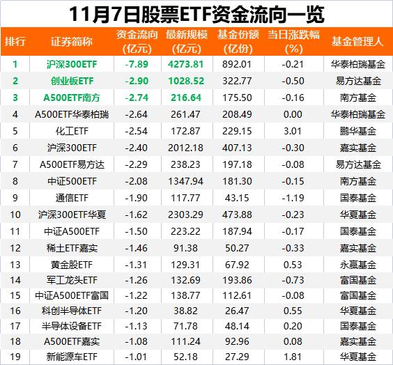 上周五(11月7日),A股三大指数震荡调整,集体收跌。市场高位调整,股票ETF市场资金流向快速切换。