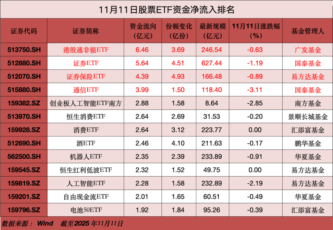 值得注意的是,资金持续大手笔加仓港股非银板块。11月11日,全市场“独苗”品种港股通非银ETF单日获资金净买入6.46亿元,净买入额在全市场ETF中居首。该产品已连续9个交易日获资金净买入,年内累计获资金净买入超200亿元,最新规模达246亿元,再创历史新高。广发基金旗下的港股通非银ETF是全市场唯一跟踪中证港股通非银行金融主题指数的ETF,指数因“67%保险+13%港交所+15%券商”的成份股底仓而备受资金关注,是全市场保险含量最高、港交所含量最高的ETF。