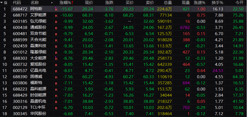 最近表现较强的光伏,今天跌疯了。阿特斯、艾罗能源、弘元绿能、通威股份、双良节能、天合光能等全线大幅走弱。