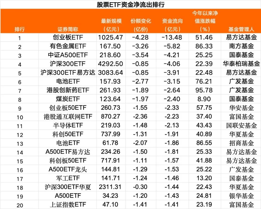 在净流出前20大股票ETF中,宽基方面,2只创业板ETF合计资金净流入超过15亿元;3只沪深300ETF资金净流入接近9.5亿元;4指中证A500ETF资金净流入接近9亿元。行业主题方面,单只有色金属ETF净流出超5.8亿元,2只电池相关ETF合计净流出5亿元,煤炭、半导体、军工等方向ETF净流出也偏多。