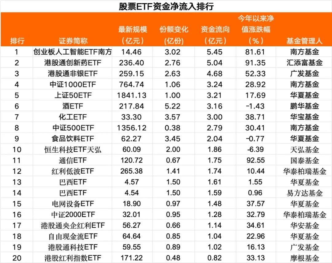 从资金净买入排行榜看,当日净流入1亿元以上的股票ETF有19只,行业主题ETF净流入居前。其中,创业板人工智能ETF南方、汇添富港股通创新药ETF、广发港股通非银ETF位居前三,资金净流入均超4亿元。