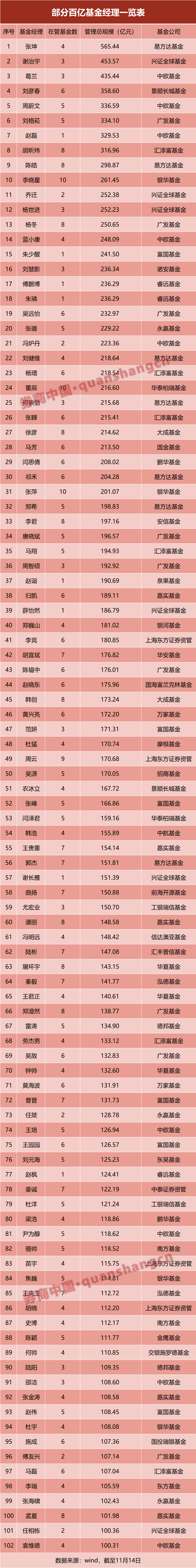 一是此前就受关注的基金经理,过往规模虽有下降但依然达数百亿。易方达的张坤管理规模逾550亿元,在“百亿”基金经理中排名第一。兴证全球基金的谢治宇和中欧基金的葛兰,管理规模均在400亿元以上。景顺长城刘彦春、中欧周蔚文、广发刘格菘、汇添富胡昕炜,管理规模均在300亿元以上。朱少醒、冯明远、曲扬、施成等此前就成名的基金经理,规模仍在百亿以上。