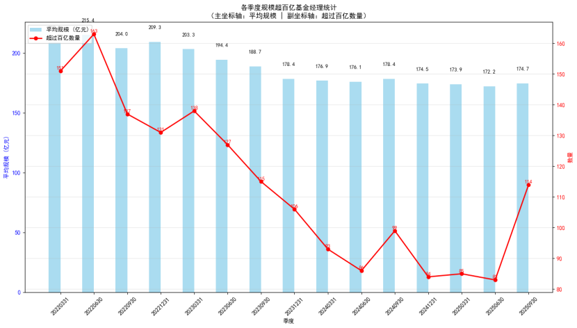 天相投顾对记者提供的统计数据显示,百亿基金经理人数在2022年一季度是151位,于当年二季度升到163位高点,平均管理规模超过200亿元。从2022年三季度开始,这一人数开始走低,到2023年末为106人。2024年一季度,百亿基金经理人数跌破100,到2025年二季度末时只有82人。从今年三季度开始,该人数时隔一年半之后重新回到100之上,截至目前约114名,平均管理规模174.7亿元。