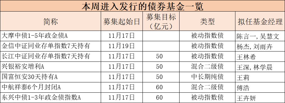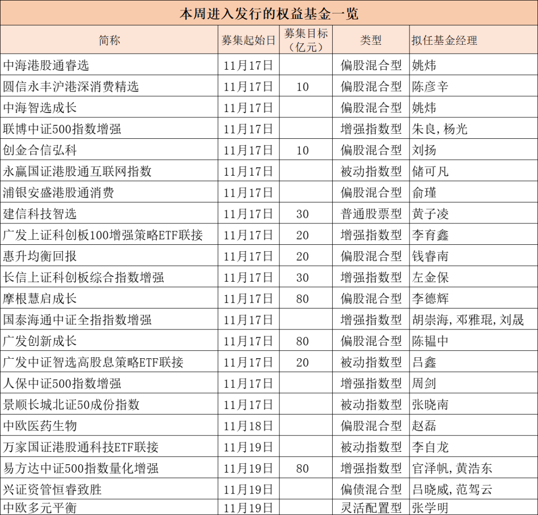 具体来看,周一(11月17日)本周33只新发基金中26只扎堆在周一开始发行,占本周新基金的78.79%;周二有1只新基金启动募集,周三有6只基金开始认购。