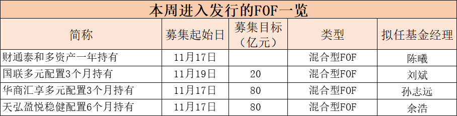 此外,本周有4只混合型FOF产品集体上架。今年以来,随着权益市场企稳回升、投资者信心逐步恢复,FOF也明显回暖,Wind数据显示,截至10月31日,全市场成立满6个月的477只FOF年内收益均为正,且平均收益率达14.29%。
