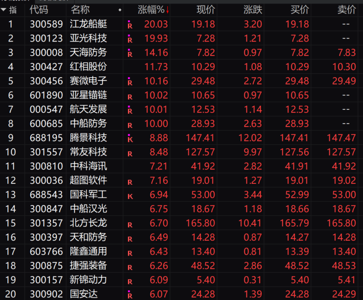 军工装备板块午后再度拉升,截至收盘,江龙船艇、亚光科技、天海防务、红相股份、赛微电子、中船防务、航天发展、亚星锚链等涨停或涨超10%,腾景科技、常友科技涨超8%,超图软件、中科海讯涨超7%,国科军工、中船汉光、北方长龙、天和防务等涨超6%。