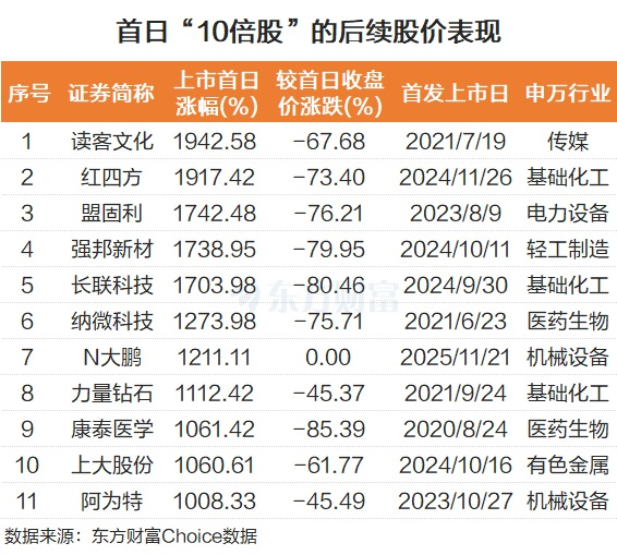 不过在首日取得“10倍”后,这些“10倍股”后续的股价表现却不太让人满意,均出现了大幅回调的情形。比如康泰医学、长联科技,在首日录得十倍涨幅后,最新收盘价较上市首日收盘价均跌幅超过80%。红四方、盟固利、强邦新材、纳微科技下跌超过70%。跌最少的力量钻石也跌超40%。