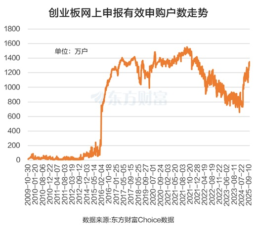 在新股中签盈利概率大增,以及指数震荡拉升的背景下,市场的打新人气也复苏明显。以创业板为例,当前新股打新的网上申报有效申购户数大约在1300万户左右,而在2023年二季度到2024年三季度这一段行情下行期,创业板新股的网上申报有效申购户数只有800万户左右,增幅大约超过了60%。