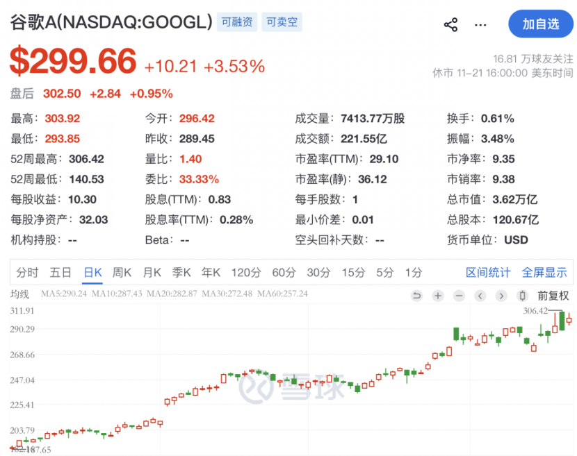 受最新发布的AI模型Gemini 3刺激,谷歌股价大幅飙涨,截至美东时间周五收盘,涨幅达3.53%,本周累计涨幅超8%,总市值升至3.62万亿美元,超越微软,跻身美股市值榜第三位。