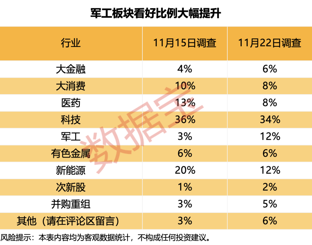 新能源、科技板块看好比例分别较上周下降8个百分点、2个百分点,最新分别为12%、34%。
