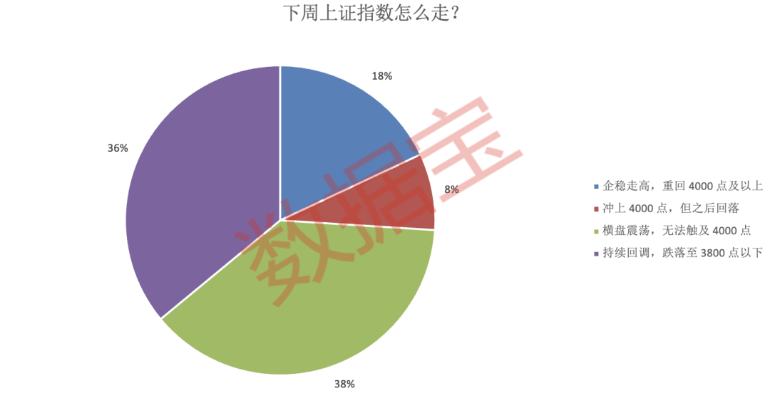 220位左右受访者认为A股将“企稳走高,重回4000点及以上”,占比18%;另有8%的受访者认为下周A股有望“冲上4000点,但之后回落”。