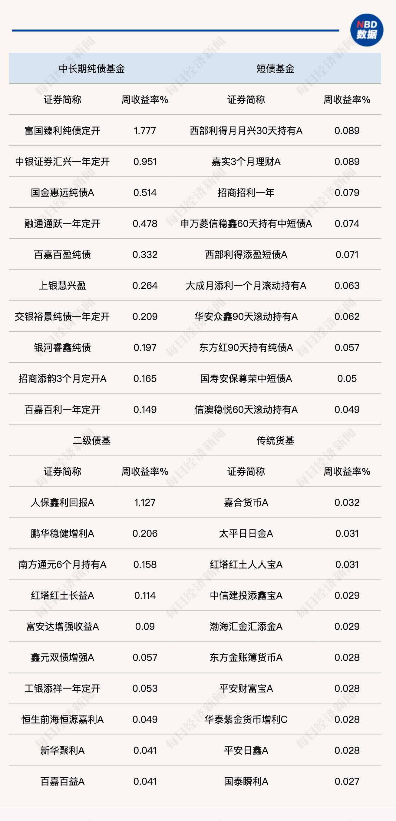 上周利率震荡上行,纯债基金收益率回落