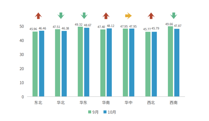 分区域来看,七大区域经营景气度指数呈现3升1平3降的趋势。其中,东北、华南、西北地区指数有所上升,分别为46.46、48.12和45.79点,华中地区指数保持47.95点稳定不变,华北、华东和西南地区指数有所下降,分别为46.38、48.67和47.87点。