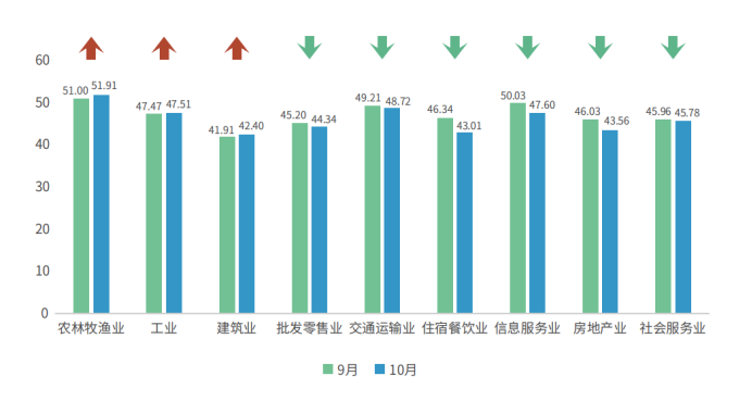 分行业来看,10月,九大行业经营景气度指数呈3升6降的趋势。10月正值秋收秋种的关键期,农事活动增加带动农林牧渔业实现较快增长;伴随着新动能成长和科技进步,工业经济获得广阔发展空间,工业经营指数微升;基建投资相关的建筑活动有加速启动迹象,建筑业经营指数略有上升。批发零售业、交通运输业、住宿餐饮业等行业经营景气度有所下降。