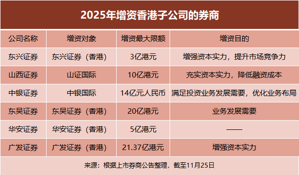 据记者梳理上市券商公告,年内东兴证券、山西证券、中银证券、东吴证券、华安证券、广发证券都(拟)对香港子公司进行增资,增资金额最高达21.37亿港元,至少也有3亿港元。
