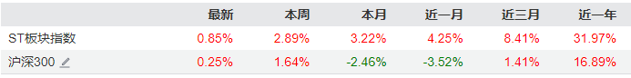 今年以来,ST板块整体涨幅超30%,显著跑赢沪深300指数,有17家公司股价翻倍;进入10月后,其涨势更加迅猛,其中ST中迪、*ST东易股价翻倍,ST合纵、*ST原尚、*ST新元等多股股价涨超50%。