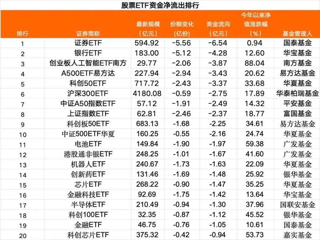 在股票ETF中,当日19只股票ETF净流出超过1亿元,部分行业主题ETF和宽基ETF净流出靠前。证券、银行、创业板人工智能等行业主题ETF,以及A500ETF、科创50ETF、沪深300ETF等宽基ETF是资金净流出较多的产品。