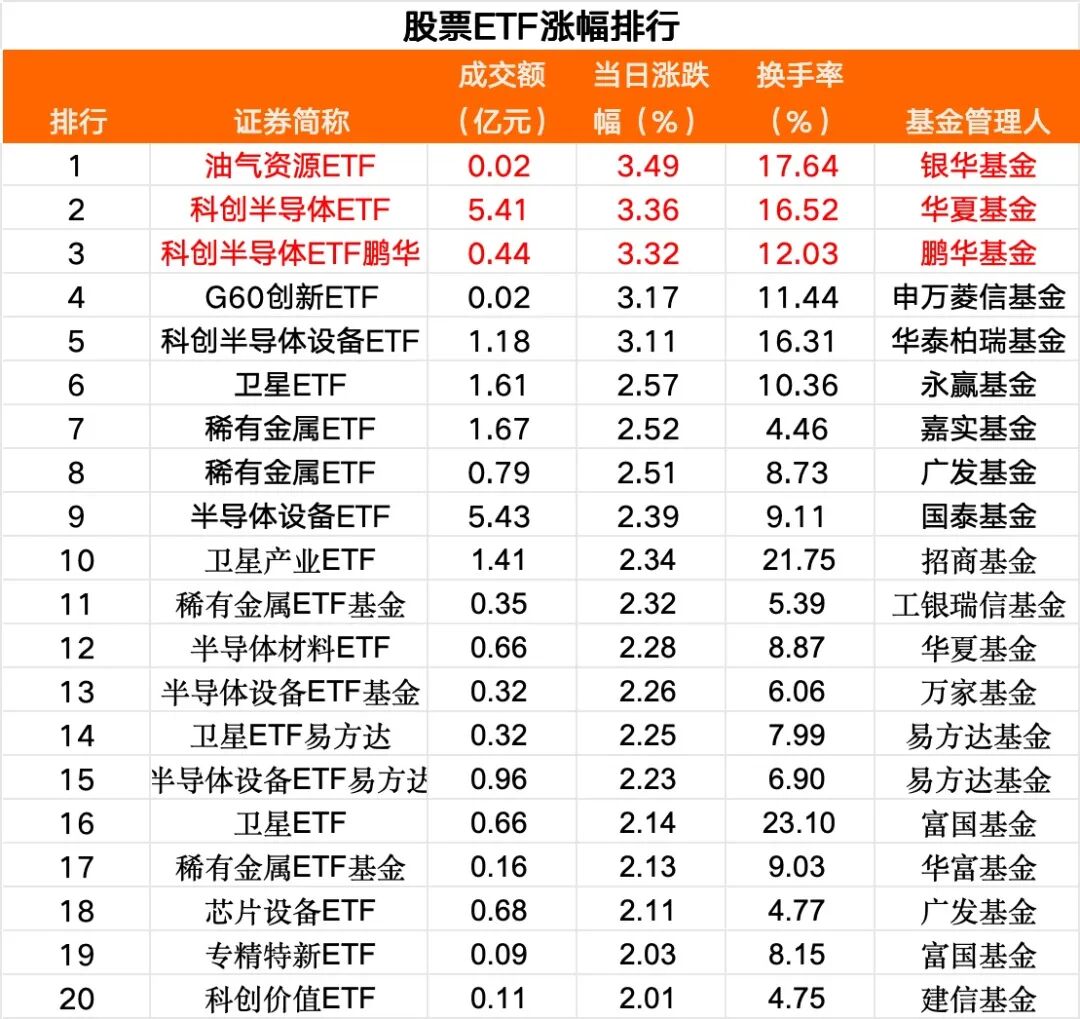 从股票ETF二级市场表现看,科创半导体板块领涨。当日除了油气资源ETF(银华基金)以3.49%的涨幅领涨,华夏、鹏华、华泰柏瑞、国泰、万家、易方达、华夏旗下科创半导体ETF、科创半导体设备ETF或半导体材料ETF,以及永赢、易方达、富国基金旗下卫星ETF等涨幅较为靠前。