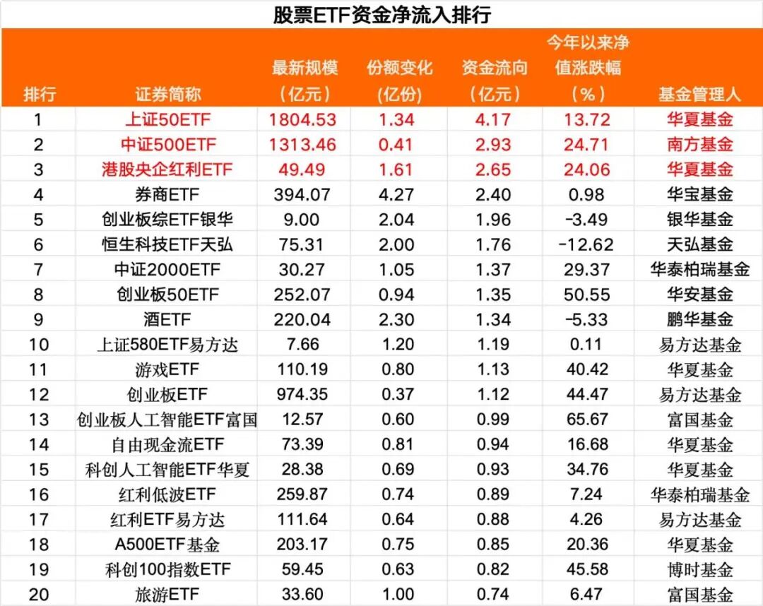 数据显示,头部基金公司旗下部分ETF净流入步伐持续。