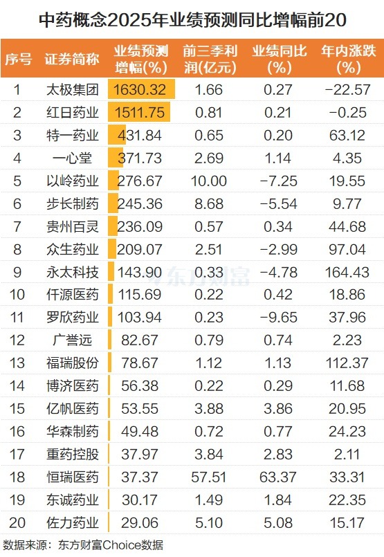 而从机构预测的2025年全年业绩来看,中药概念股中有11家公司业绩或将翻倍。太极集团高居榜首,2025年业绩预测同比增长1630%。红日药业紧随其后,业绩预测同比增长1512%。特一药业、一心堂、以岭药业、步长制药、贵州百灵等业绩预测增幅也靠前。