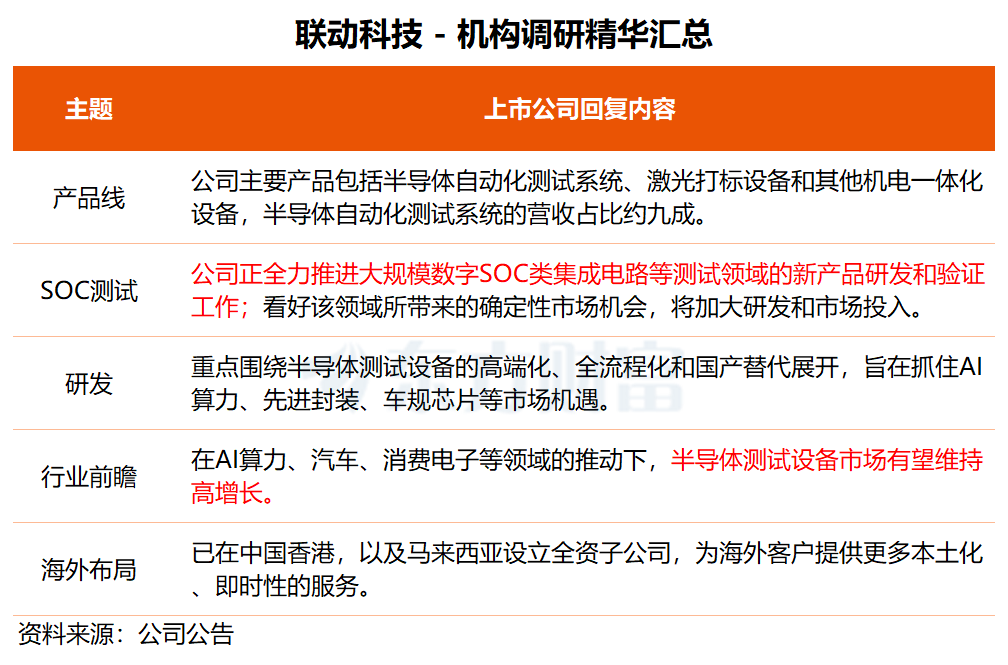 关于SOC测试设备,联动科技透露,公司正在全力推进大规模数字SOC类集成电路等测试领域的新产品研发和验证工作,产品尚未量产。