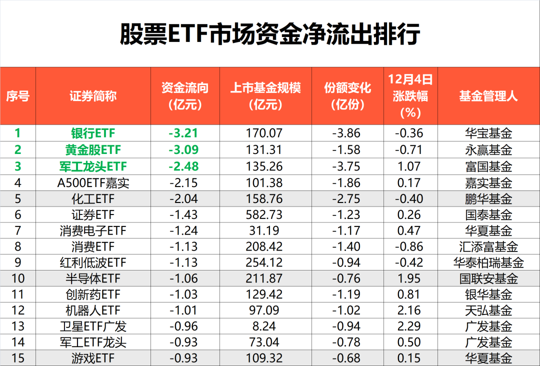资金流出方面,昨日行业主题ETF净流出居前,达12.02亿元。其中,银行ETF、黄金股ETF昨日净流出均超3亿元,位居市场前列。