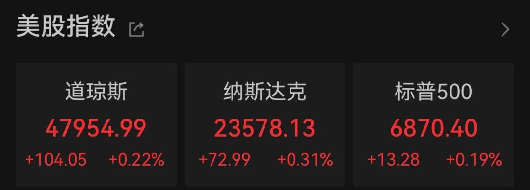 当地时间周五,美国三大股指小幅收涨,道指涨0.22%报479954.99点,标普500指数涨0.19%报6870.4点,纳指涨0.31%报23578.13点。其中,标普500指数、纳指收获四连涨。本周,道指涨0.5%,标普500指数涨0.31%,纳指涨0.91%。