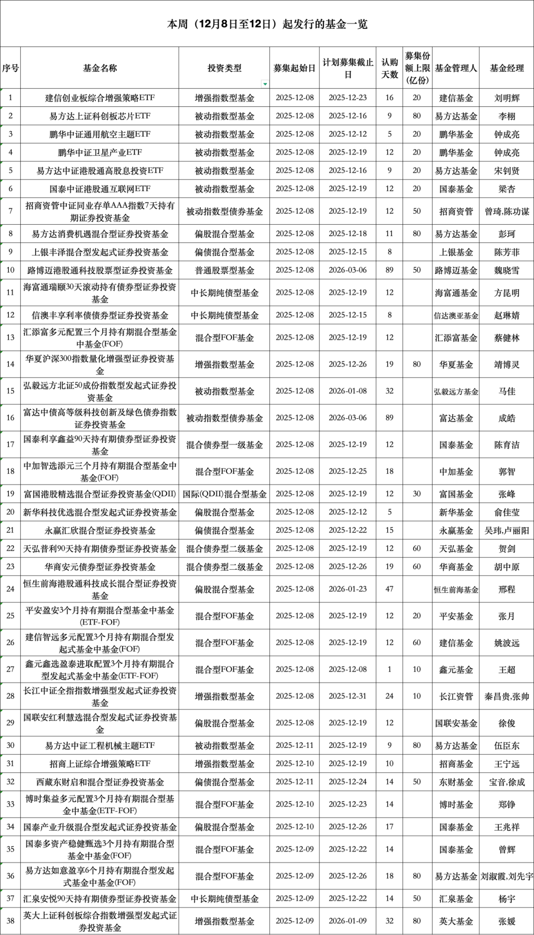 本周(12月8日—12月12日),全市场共38只新基金面向投资者公开发行。