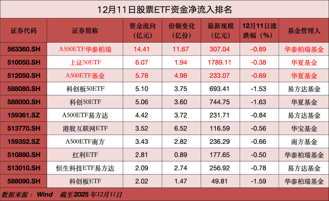 12月11日(本周四),A股三大股指震荡下挫,创业板指跌1.41%,深证成指跌1.27%,上证指数跌0.7%。在市场震荡回调之时,股票ETF资金流向相对平稳,单日净流入44.93亿元。