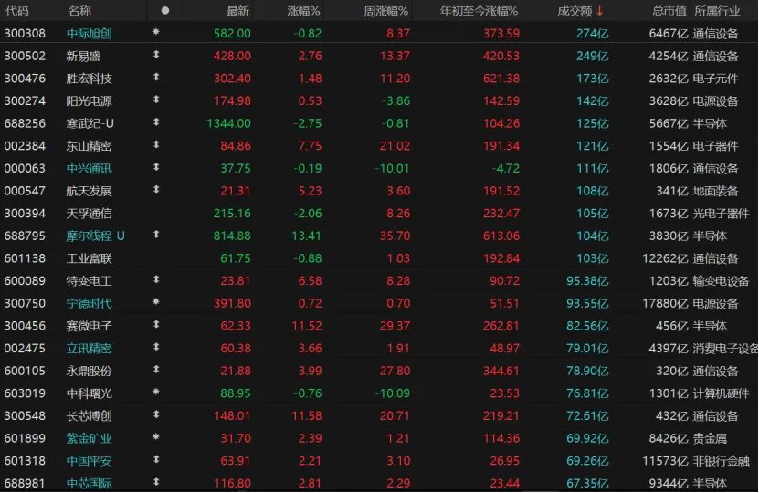 个股涨跌互现,2683只个股收涨,涨停股83只;2612只个股收跌,跌停股26只。CPO(共封装光学)概念龙头股“易中天”日成交额靠前,新易盛涨近3%,但中际旭创、天孚通信收跌。近日大涨的摩尔线程回调逾13%报814.88元/股。
