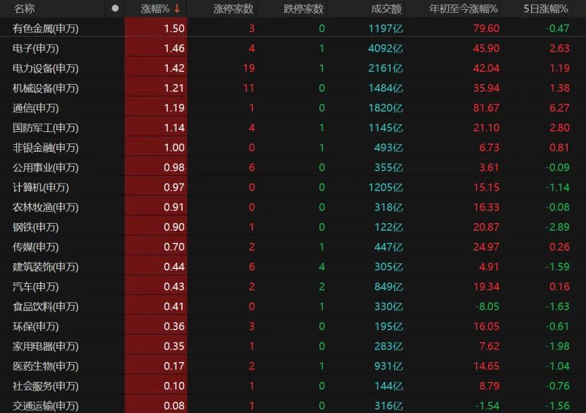 31个申万一级行业中,共计21个收涨,有色金属、电子、电力设备、机械设备、通信、国防军工等热门赛道涨幅均超过1%。商贸零售、综合、房地产等板块收跌。