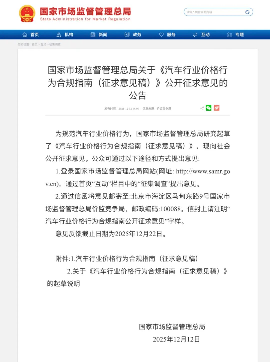 12月12日,国家市场监督管理总局介绍,为规范汽车行业价格行为,国家市场监督管理总局研究起草了《汽车行业价格行为合规指南(征求意见稿)》(以下简称“《指南》”),现向社会公开征求意见。《指南》细化了汽车生产企业价格行为规范,明确了从整车到零配件生产、从定价策略到销售行为各环节的价格合规要求。