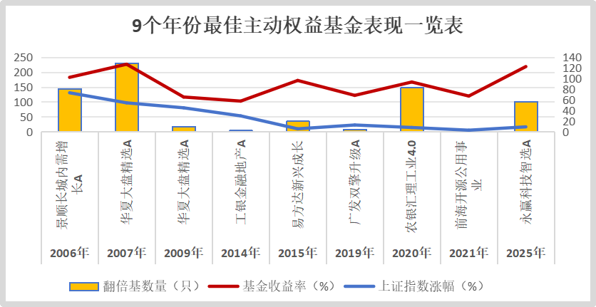 记者对比了千禧年后的9个行情年份发现,无论是2019年前的普涨行情还是此后的结构行情,主动权益基金持续大放异彩,特别2025年高仓位基金攻势越发凌猛,收益高度和翻倍基数量均在历史高位。