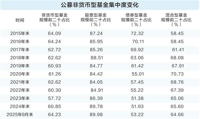 站在2025年末回望,在系列重磅政策的指引下,公募基金行业的高质量发展已步入关键阶段。在此进程中,以非货币型基金(以下简称“非货基”)规模集中度为镜,可以清晰窥见行业竞争生态的深层演变。