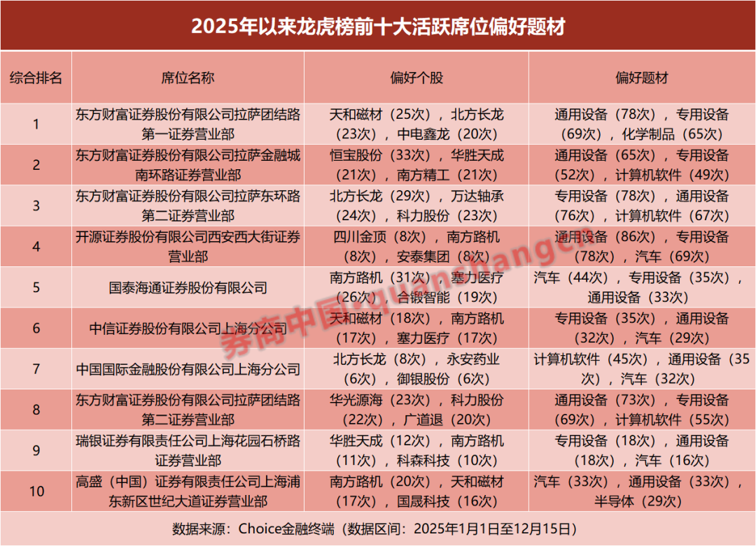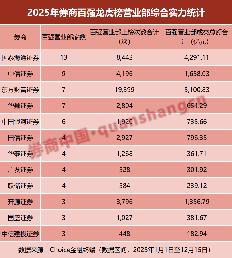 Choice数据显示,2025年1月1日至12月15日,剔除沪股通、深股通及机构席位后,排名前100的交易席位上榜次数达6.20万次,累计成交2.10万亿元,成交金额相比2024年全年增长约48%。