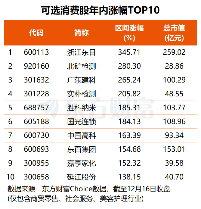 市场表现方面,共140只可选消费股年内股价实现上涨,占比约66%,其中,浙江东日、国光连锁、东百集团、若羽臣等11股年内股价翻倍,依依股份、全新好、凯撒旅业等19股年内涨幅在50%至100%之间。
