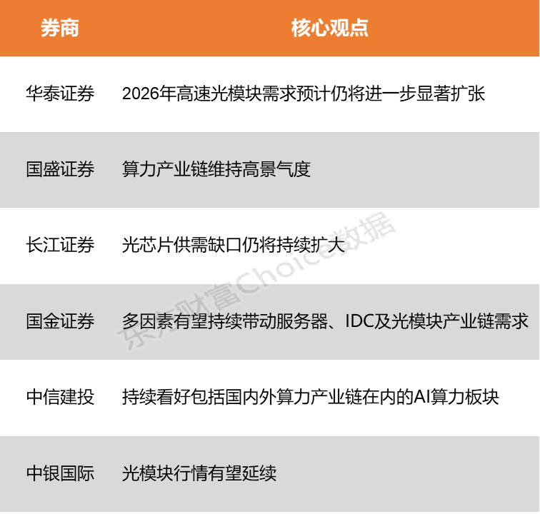 华泰证券进一步指出,在海外CSP在加码AI算力投资的背景下,2026年400G、800G、1.6T等高速光模块需求预计仍将进一步显著扩张,有望带给新晋供应商导入窗口期。国盛证券则表示,技术创新、算力基建与产业应用正形成良性循环,算力产业链维持高景气度。