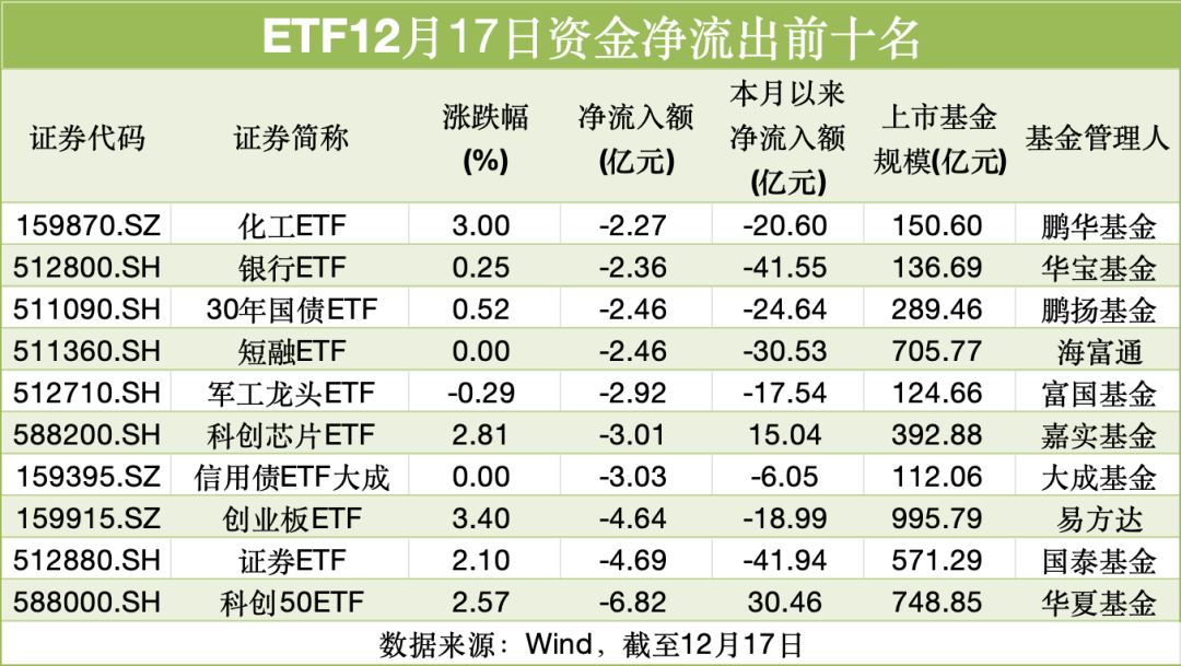 净流出方面,股票ETF中,科创50ETF、证券ETF、创业板ETF资金净流出居前,债券ETF中,信用债ETF大成、短融ETF、30年期国债ETF遭遇资金净流出。