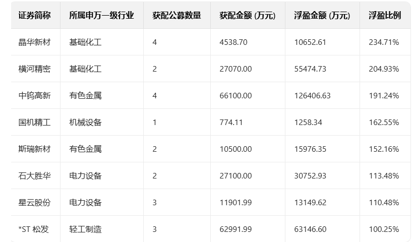 其中,晶华新材以234.71%浮盈比例位居首位。该股的定增吸引了财通基金、诺德基金、兴证全球基金等4家公募机构参与,合计获配金额0.45亿元,浮盈金额超1.06亿元。