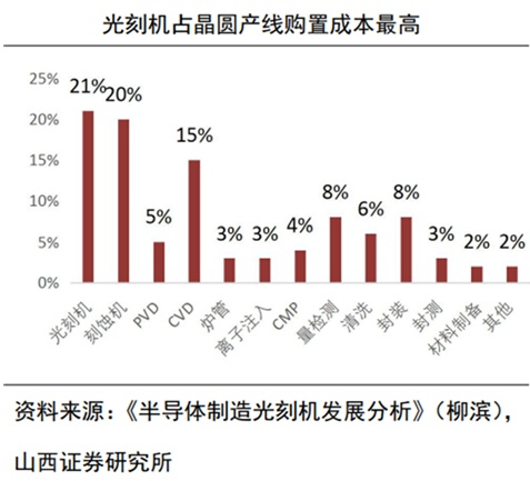 光刻机作用如此之大,也决定了其在芯片生产中的成本之大。山西证券根据《半导体制造光刻机发展分析》统计,芯片生产产线建设中,光刻机购置成本最高,达到设备总投资的21%-23%,光刻工艺耗时占生产环节的一半,制造成本占到芯片制造成本的30%以上,光刻机成为半导体制造的核心设备。