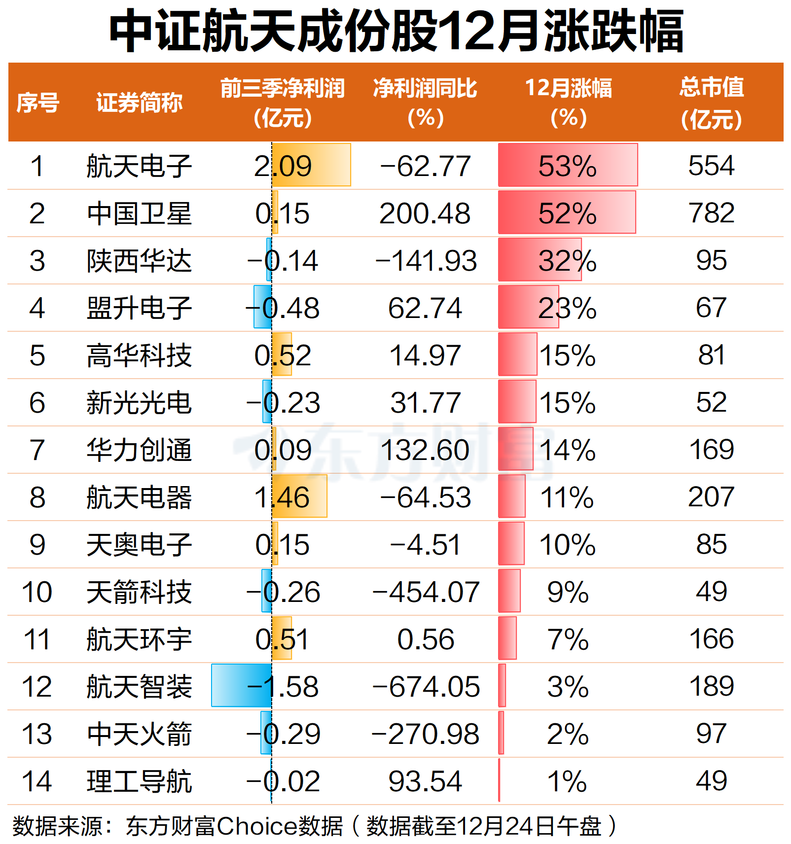 值得注意的是,上述航天股业绩分化也十分明显。数据显示,今年前三季度,中证航天14只成份股净利润盈亏参半,其中,航天智装亏损金额最大,为1.58亿元;其次是盟升电子,亏损近4800万元;中天火箭、天箭科技、新光光电等也均出现亏损,金额均超2000万元。