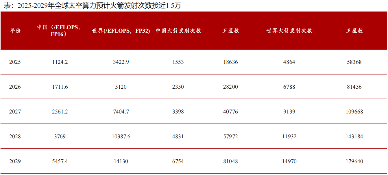 以“三体”星座作为参考,其首次发射共搭载12颗算力卫星,总计携带5POPS的算力。若2029年全球算力的2%转移到太空,对应中国6800次火箭发射,全球1.5万次火箭发射。目前执行组网卫星发射任务的仍然以国家队“长征”系列为主,长征系列低轨运力相比 SpaceX猎鹰系列差距较大,且其需承担军方、探月等多个重要工程,我国火箭总运力严重受限。