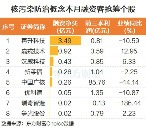从个股角度来看,核污染防治概念中,有8股本月被融资客融资净买入,其中再升科技被融资净买入3.49亿元。嘉戎技术紧随其后,被融资净买入0.92亿元。汉威科技、新莱福、中国广核也被融资净买入居前。