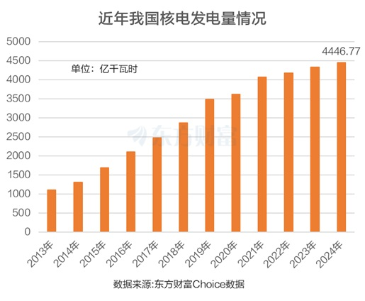 中国核能行业协会的数据显示,今年前9个月,我国核能发电量为3483.65亿千瓦时,同比增长6.27%。过去的2024年,我国核电发电量为4446.77亿千瓦时,创2013年以来的新高。
