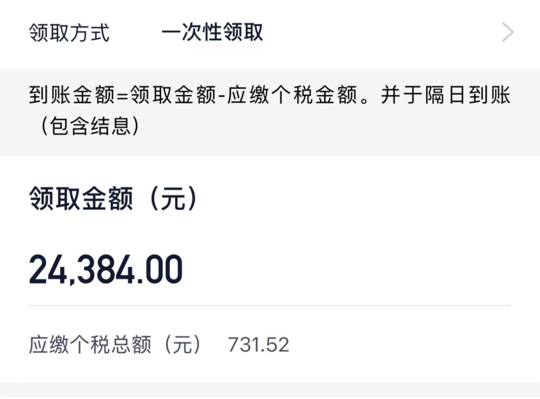 此外,一位于今年下半年退休的金融机构高管,于近期从个人养老金中取回了养老金本金和利息,一共是24384元。他对记者分析到,退休前他曾两次在个人养老金账户里存入两笔资金,每笔1.2万元,一共是2.4万元。24384元中有384元养老金利息。他于近期把这笔钱从养老金账户提到了一般账户上,在这过程中需要缴纳的税额是731.52元。