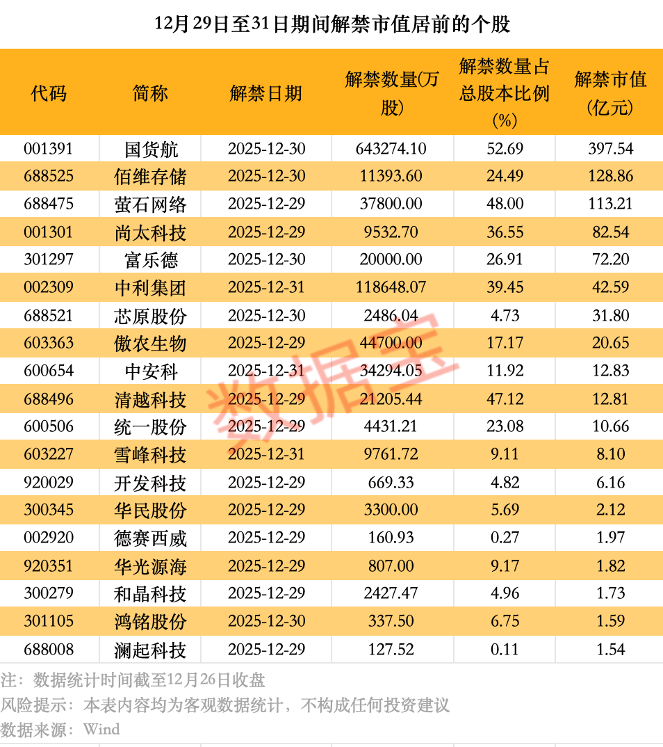 据证券时报·数据宝统计,12月29日至12月31日期间,将有34股有限售股解禁,合计解禁股份96.81亿股,以最新收盘价计算(下同),总解禁市值953.6亿元。