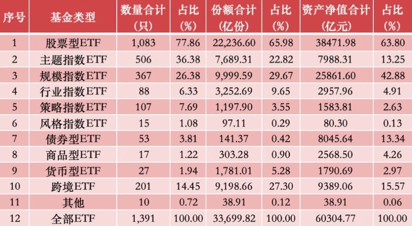澎湃新闻记者据Wind数据统计,截至12月27日,国内ETF总规模已突破6万亿元关口,达6.03亿元。其中,股票型ETF占据主导地位,规模为3.85万亿元;跨境ETF规模为9389.06亿元,债券型ETF规模为8045.64亿元,商品型ETF规模为2568.50亿元,货币型ETF规模为1790.69亿元。